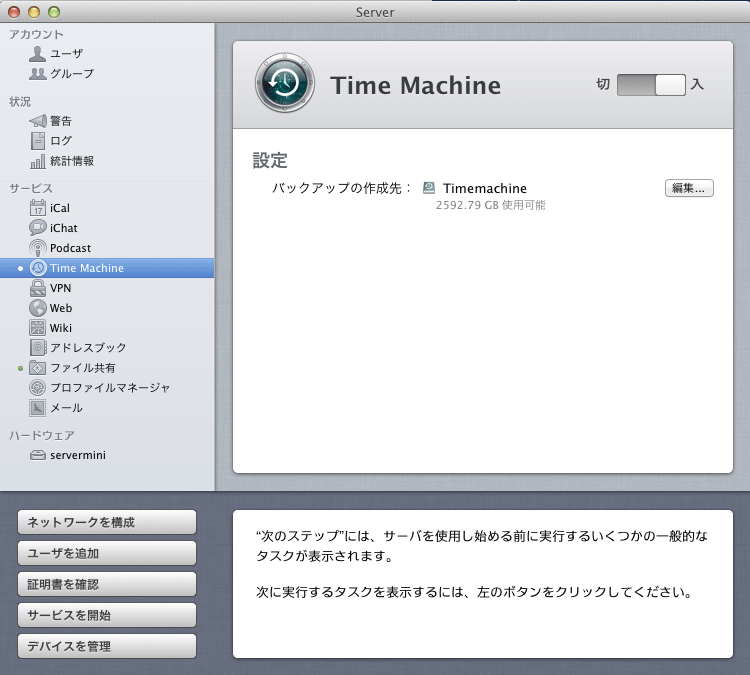 os x Lion server 「Server.app」でTime Machineサービスを使うと外付けHDDをネットワーク対応のTime Machineとして使えるようになり、これでつれあいのmac mini、MacBookもwi-fi Lan経由でTime Machineバックアップさせています。Macを複数台持ってる方は os x Lion server app をApp storeから追加購入するだけでカンタンに設定できます。