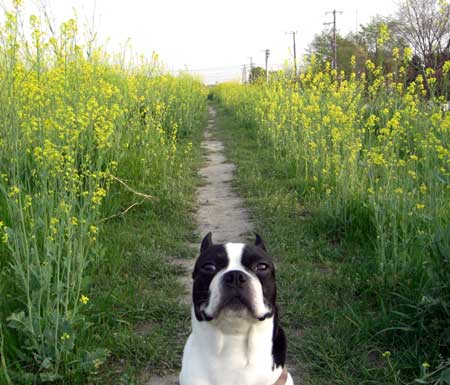 この時期、さんちゃんがお気に入りの夕方の散歩道は、近くの河川土手に咲く菜の花に囲われた一本道です。今日は写真撮影用に「おすわり!」「待て!」を繰り返したんで、さんちゃんの顔もすごく緊張してこわばってます。
