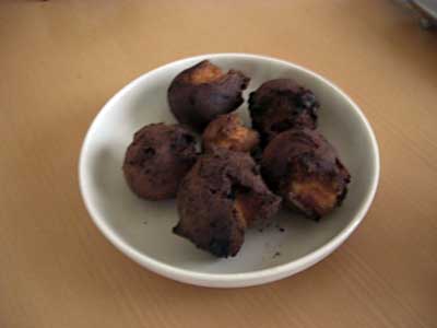 作り方はいたって簡単です。卵大玉3個とサラダ油少々を軽く攪拌したところに沖縄産のアンダーギーミックスをぶち込んで、へらでこねこねして種は出来上がり。ピンポン玉大の種を150〜160℃の低温油でじっくり10分弱の時間をかけて揚げていきます。連れあいのこだわりといえばココナッツとドライフルーツ(昨年失敗したクリスマスケーキ作りで余っていた材料)を練り込むことくらいですか。跳ねる油が苦手な連れあいに代わって揚げ物はほとんど自分が担当。結局連れあいがやったのはこだわり(?)指示と皿への盛りつけ作業だけです。そして完成したのがコチラ...