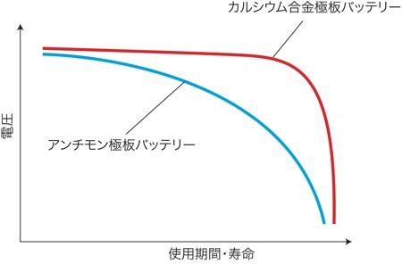 極板にカルシウム合金を使用し、サルフェーションの発生を抑制、併せて液べりも抑えられるので、バッテリーの初期性能を長く保持できます。しかし本質的には耐熱性に劣り、高温下にさらされると極板クラックが発生する。スズ、銀等を添加することで起動電圧を安定的に取りだし、CCA(コールド・クランキング・アンペア)性能を含む始動性が高い。