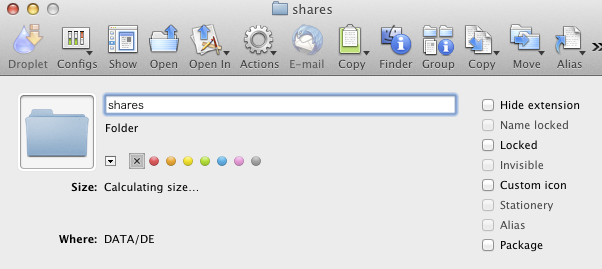 WHSのHDDを外付けHDDケースに入れてMacに接続する時点で、WHSのHDDへのアクセス権は”読み出しのみ”になっていて、FinderでDE/SHARESフォルダを見つけることができません。そこでFileBudyのGet infoメニューからDATAボリュームの不可視領域にあるDE/SHARESフォルダを選択、サブメニュー"show"でFinderに格納データを表示させられます。