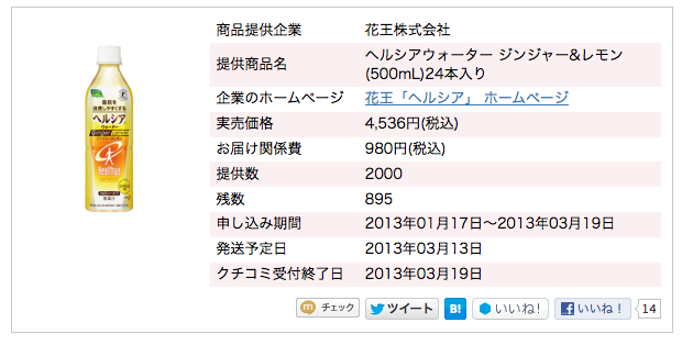 ときどき利用させてもらっているお得で楽しいモニターサイト!もにったーに「ヘルシアウォーター ジンジャー&レモン(500mL)24本入り」のモニター募集があったので申し込みました。なんと@41円、ジンジャエールを常飲しているジブン向けです。
