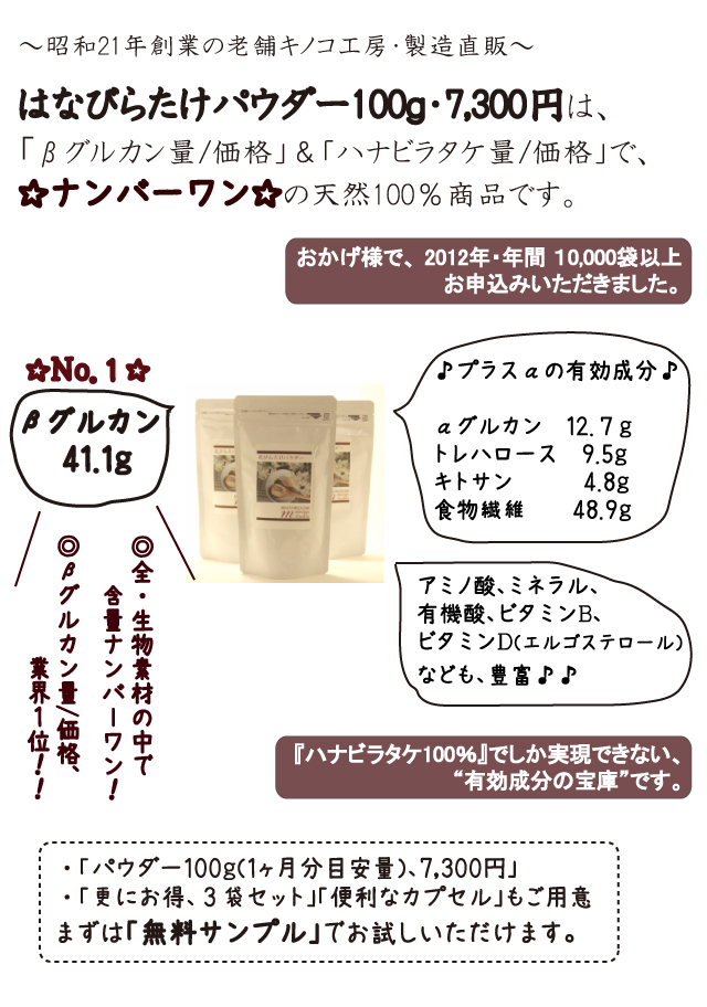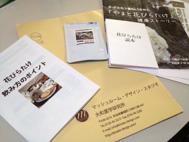 1週間もせずにサンプル・パックとハナビラタケに関する資料どっさり入りが送られてきました。最近はこの手の健康食品で”癌に効きます”旨の宣伝文句はご法度と聞いていますが、資料の中にはやっぱり”癌に効きます”が書いてありますねぇ...大丈夫かしら...