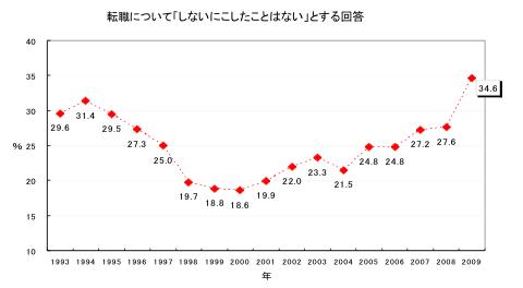 このデータは「今の会社に一生勤めよう!」と答える人間と「転職しないにこしたことはない」と答える人間の二極化が進んでいるのか、二枚舌の優柔不断な輩が増えているのか解らないのですが、なにしろ会社や仕事がまだ解ってない新入社員のことですから、「この不況下で放り出されたくない」けど「嫌なことがあったら他を探そう」というところなんでしょう。