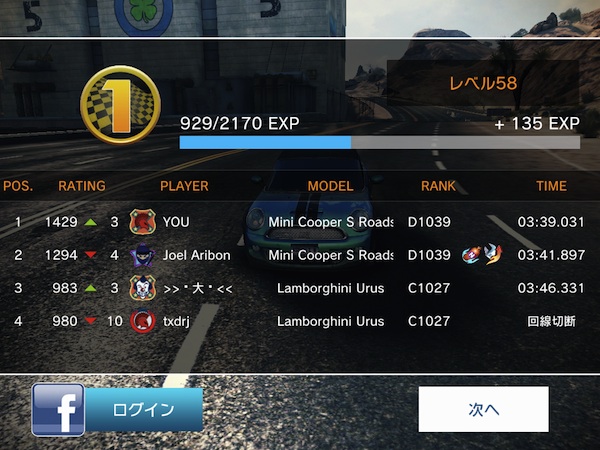気安めに楽しむぶんにはお金が掛かりません。最低(D)クラスのMINI Couper Roadstarを貯まったポイントでフルチューンして参戦中です。対戦プレイで勝利するとポイントが貯まって、SCOREもだんだん上昇していますが、対戦相手がBクラスの高RATEなクルマでそこそこ高SCOREなユーザーだったりすると勝負にならなかったりします。