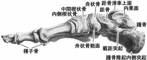 足首から下の「脚」は、26個の骨と19+多数の筋肉組織で構成されていて「内側縦アーチ」「外側縦アーチ」「前足部横アーチ」「中足部横アーチ」という、脚の機能形状を造るように神様が設計されました。 扁平足というのはこの骨格の崩れて「土踏まず」の方向に偏ったものと言うことができます。 ウチの連れあいの場合、先天的なものなのか、(東京の雑踏の中でもすぐ解る)姿勢の悪さに起因するのかは解りませんが、脚を眺めると例外に漏れず諸処が変わっています。特徴的なのかアーチがつぶれた状態なので足の甲もペッタンコ。舟状骨が内側にずいぶん張り出したような形状で、体重を脚の内側で支えているような感じです。