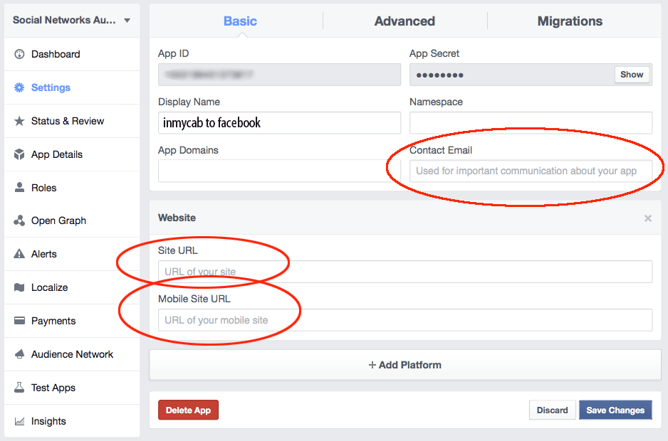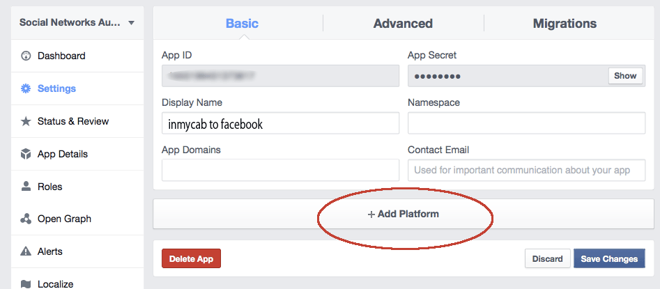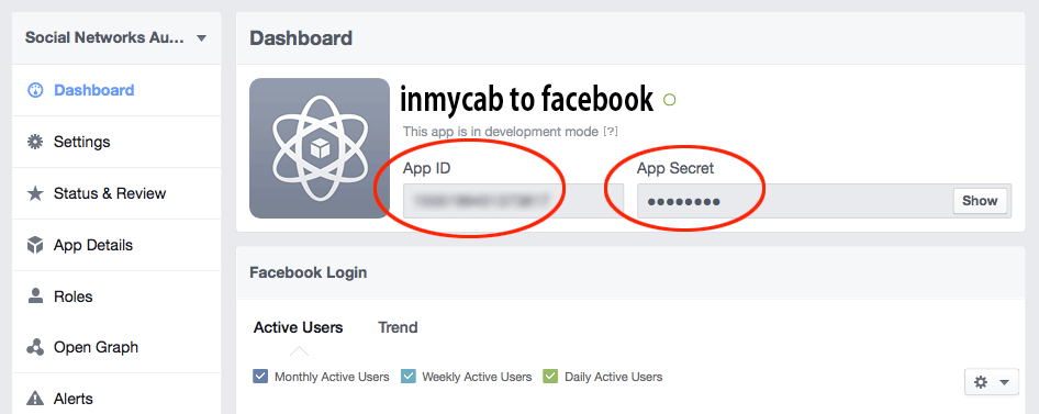 このとき自動設定された APP ID 及び App Secret を控えておきましょう。プラグイン設定で使用します。(App Secretは右端のshowボタンで表示されます)