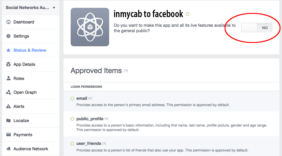 左メニュー:Status & Review で設定画面を移動表示させたら、右端にある「OFF」ボタンを押して「ON」(有効)にします。これでfacebookアプリの設定は完了です。