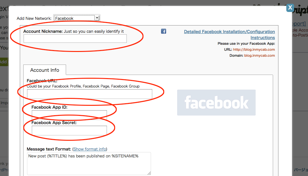 WordPressサイトの投稿記事情報をどんな風にfacebookに反映させるかは"Message text format"や”Post Type”の設定をトライ&エラーでジブン仕様に設定します。