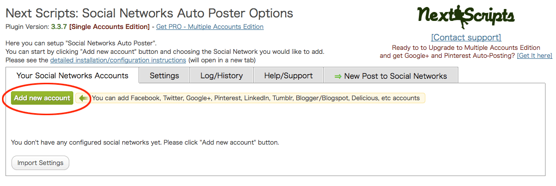 Social Networks Auto-Posterプラグインのインストール自体は通常手順どおりです。プラグインの設定画面に移動したら、「Add new account」ボタンを押します。