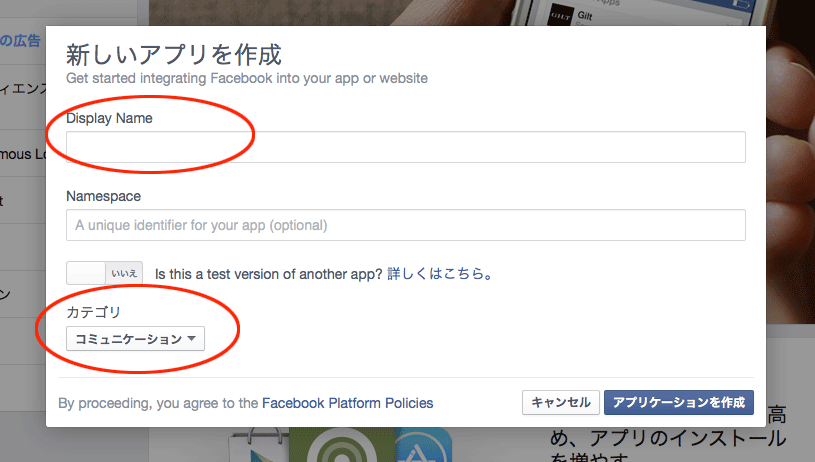 Display Name を適当に入力(例:inmycab to facebook)し、カテゴリーを選択したら「アプリケーションを作成」ボタンを押します。
