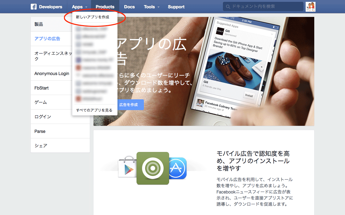 facebookログイン状態でfacebook Developer Conference(https://developers.facebook.com/)にアクセスします。 メニュー:Appsから「新しいアプリを作成」を実行します。