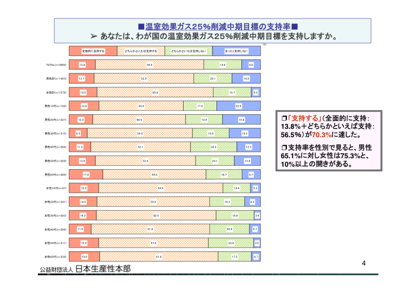悪いことをするわけでもなかろう...くらいの意識しか持たない人が多いだろうし、情緒的に流されやすい女性の比率が多いのも頷けます。ただ、CO2削減がGDPの伸びを抑制することにつながる...話も景気回復にマイナスと想像してしまうお父さん達は、諸手を挙げて賛成できないでしょうしね