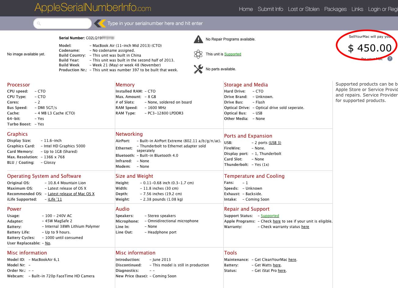 一昨年よりサポート業務をしていた会社さんとの契約が満了し、借りていたMid2012 11" Macbook Airを返却するにあたり、せっかく慣れ親しんだ機種なので自前のMacbook Airを調達して中身を丸ごと移すことにしました。ヤフオクで調達することも考えましたが先の会社さんの隣にあるオフィス向けPCレンタル屋の社長が「Mid2013 でメモリ8GBにしたCTOモデル」の中古品があって、買取相場の参考に使っているというappleserialnumberinfo.comの提示価格で売ってくれると言う。(シリアル番号打ち込むとモデルの仕様と買取価格が提示されます)