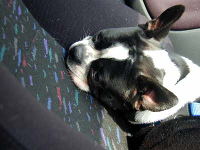 カテゴリーまで作って登場することがあまりありませんが、うちのリビングで生活しているボストンテリアの「さんちゃん」は、4月25日で3才の青年犬です。たまにドライブに連れて行くと喜んでいるのは小一時間で、すぐに飽きてお昼寝タイムに入ります。助手席に乗るときは背もたれの角に顎を預けるような格好でまったりしています。