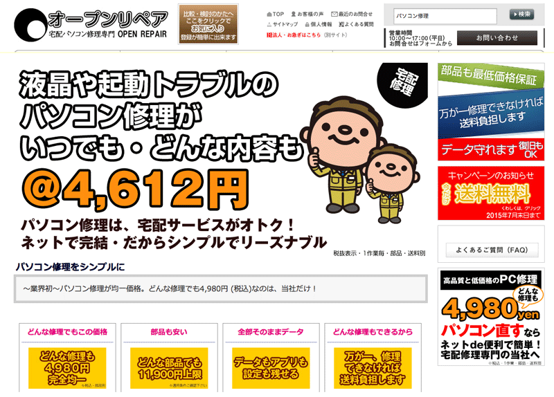 ”どんな部品でも11,900円上限”とにわかには信じられないコトが書いてあります。トップページをざっと読む限りは「修理代:16,000円かぁ...」とか思ってしまうのですが、”オープンリペア”でWEB検索してみると...