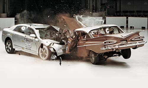 米国の保険機関の団体IIHS(Insurance Institute for Highway Safety)が同機関の設立50周年を記念して、50年前の米GM社の「Chevrolet Bel air」と2009年モデルの「Chevrolet Malibu」を衝突させその映像を公開している(林 達彦=日経Automotive Technologyより)のだが、