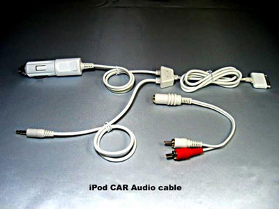 これに接続するのがipod用のケーブル、何種類も販売されていますが今回選択したのは、Yahooオークションで1980円!で販売されていたもので、シガーソケットから充電もできるタイプ。ipodを使わないときはRCAケーブルも中途から外せるようにできて便利です。