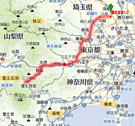 まず富士急ハイランドのHPを覗いて営業時間・割引券・アトラクションをざーとチェック(10分)、高速道路の渋滞箇所チェック(11時現在、首都高・中央道-高井戸-八王子-相模湖で渋滞25km)やっぱりやめようかなかぁと弱気になりますが、渋滞に無縁な高速道路を発見。 圏央道...そういえば桶川北本インターチェンジが開通してました。普通ならさいたま市から御殿場方面へのアクセスには、副都心-首都高-中央高速(もしくは東名)なのですが、渋滞確実ならば...急がば回れすることにします。ウチから産業道路経由であれば桶川北本インターまで30分ほどなので、圏央道ルートが早いと判断。(5分) さんちゃんの朝ご飯・ウンチタイム・給水・お留守番準備(5分)。つれあいの準備した持ち物チェック(5分) あとはiPhone経由で情報収集しながら進むと言うことで出発です。(11:30)