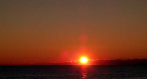 直線コースではないけど深夜の4号線バイパスは高速道路と同じ、50号線も片側2車線なので、時間的には最速コースのはず.....なんですが、水戸手前で東の空が明るくなってきて、かなりギリギリ。信号ストップももどかしげにカーナビでショートカットを検索。日の出まであと5分、カーナビ指示ルートではないけど、ゴルフコース内の側道を抜けることに! すでに路肩はクルマでいっぱいでしたが、神社境内に向かう側道脇にスペースを見つけて駐車。日の出1分前に到着! 連れあいはデジカメ持って海岸線にダッシュして消えていったので、自分はさんちゃんと松林の隙間から初日の出を拝むことしました。