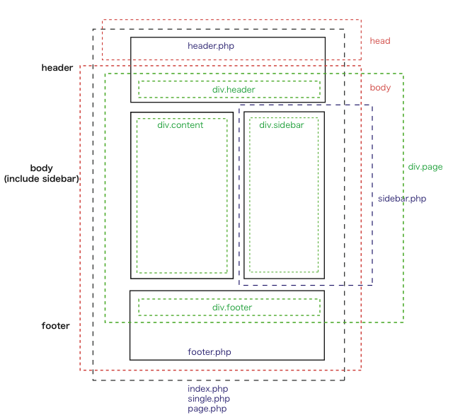 ジブンの解釈上の構造なので正確な意味合いは違うかもしれません。 教科書上で扱われる<header/body/footer>という組立と、WordPressのphp構造<header.php/index.php/sidebar.php/footer.php>及び定義されている構文上の構造はけっこうにズレがあります。このズレの部分が多分にオリジナリティを作るのに寄与するのですが、読み解くのが少し面倒だったりします。今回はなるべく簡単に変更したいので全体を広げた分(div.page)だけ、サイドバーを拡張(div.sidebar)して,サイドバー内に2カラム(div.colTwo, div.colThree)を押し込む構造にします。