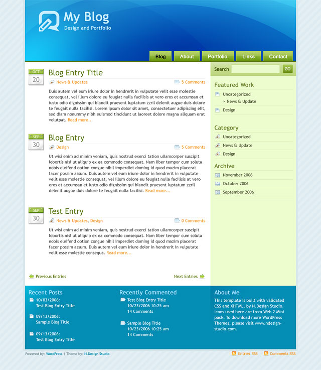 このWordPreeブログの元テーマは、「 Web Designer Wall」主催者の別サイト「ndesign-studio」で配布しているのWPテーマ「GlossyBlue」です。見てくれは少々変更しましたが小道具はそのまま使わせていただいています。