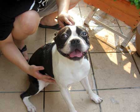 カメレオンさんが家に来てから、あまり寵愛を受けなくなったさんちゃんですが、最近の暑さで散歩のときにははぁはぁ言い放しで、毛の抜け替え時期でもありましたので、玄関前で「毛抜き」掃除をしてもらいました。