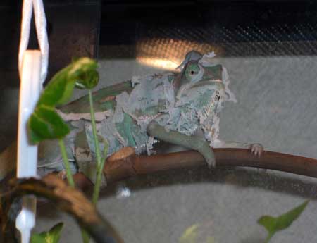 2匹のカメレオンのうち、食欲不振で元気がなかったきんちゃんも復調してコオロギをよく食べるようになって、昨日気がつくと脱皮の最中でした。