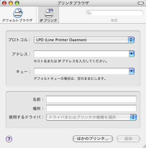 ・プリンタを追加するのに(+)ボタンをクリック。「IPプリンタ」を選択。「ほかのプリンタ」をクリックします。