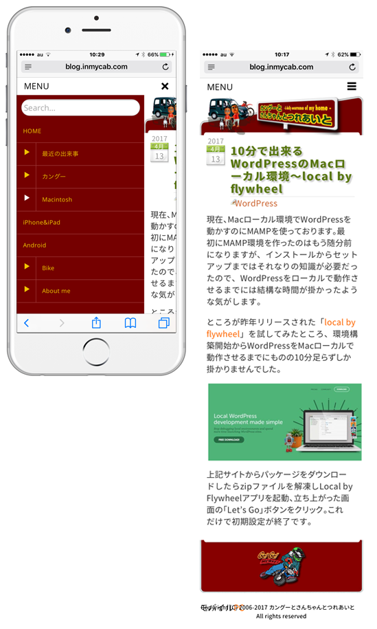結局、モバイル対応に選択した方法は、元テーマを改造したモバイル版設定テーマを別途用意してスマホ・タブレット向けにテーマを切り替える方法。着地点ではないですが、デザインはPC版オリジナルサイトから大きく逸脱せずに、使い勝手だけは向上させよう、という意気込みでもちろんお手軽に、を具体化した今回のオリジナル版モバイルサイトです。