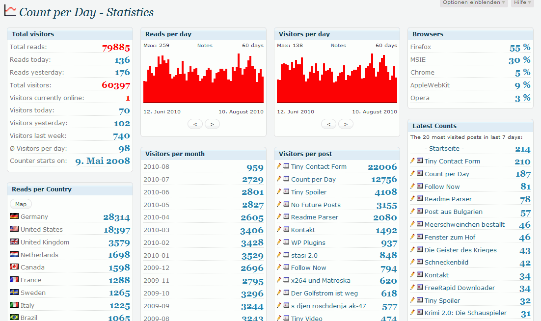 日本語版はまだ無いようですが、投稿タイトル等の文字化けもなく項目名も難しい内容ではないので英語版でも問題なく使えます。Google Analitics程の機能詰め込み感もなく、必要十分のインフォメーションではないでしょうか。「カウンター」を表示させること自体には興味がなかったのですが、訪問者のアクセス状況をWPダッシュボードで手軽に確認できるのはいいですねぇ。お勧めです。