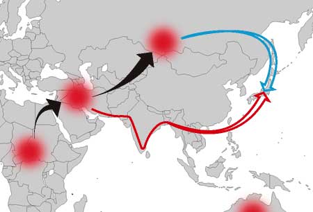 自分の先祖は中央アジアグループからB型が多いモンゴリアン経由で日本に渡来したんでしょう(青色)氷河期の厳寒地方をくぐり抜ける知恵と決断にいつも迫られていた...そんな成り立ちを想像させます。それに対して連れあいの先祖は中東グループから自然まかせに海岸線を東に辿ったなかから、気まぐれに海路を北に渡来した人達(赤色)なんでしょう。氷河期のさなかでも比較的穏やかだった赤道直下を歩いてきた人達です。のんびりブラブラやって来たんだろうなぁと思いませんか?(笑)