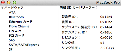 Mac ノートブックは USB バスを使って SD カードスロットと通信し、最大速度は 480 Mbit/秒です。※ Mac デスクトップ(iMac、mac mini)では、PCIe バスを使って SD カードスロットと通信し、より高速なデータ転送を行います。※ ※アップルの「Mac の SD および SDXC カードスロットについて」から抜粋 「480 Mbit/s」というのはUSB2.0の最大データ転送速度ですが、2013年以降USB3.0を搭載したMacBookもそうなのか?ちなみに2013Macbook Pro搭載のSDカードスロットはプロファイルで「リンク速度:2.5GT/s」と表示されます。これはmac miniと同じ値でPCIexpress接続で動作しているようです(アップルの公式説明とは違っています)