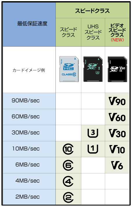 SD/SDHC/SDXCカードの読み書き転送速度は、統一規格「SDスピードクラス」によりカードが対応する最低限の読み書き速度を保証しています。SD/SDHCカードのスピードクラスとして2、4、6、10の4段階、読み書き時のデータ転送速度としてそれぞれ最低2MB/s、4MB/s、6MB/s、10MB/s。さらにSDXCカードのUHSスピードクラス、ビデオスピードクラスでは90MB/sに達しています。