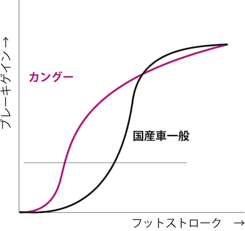 ずっと国産車を乗り継いだヒトが欧州車を初めてドライブすると「いきなりブレーキ効き過ぎ!」と騒ぐのは、有効なゲインが得られるポイントが国産車よりずっと手前だからで、国産車のように踏むといきなり急制動な「カックンブレーキ」に感じてしまいます。国産車をブレーキ調整して有効ゲインまでの踏込ストローク量を調整してもフットレバー比やマスターシリンダのブースト比は変わらないので単純に起ち上がりゲイン強烈な扱いにくいシロモノに成ります。