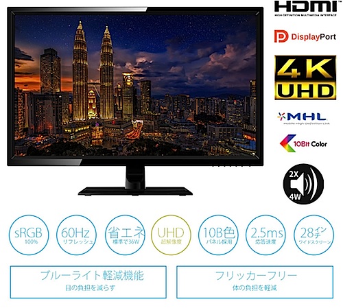 JAPANNEXTからsRGB 100%カバーの28型4K(3,840×2,160ドット)液晶ディスプレイがリリースされました。垂直同期がAMD FreeSyncに、リフレッシュレート60Hz、応答速度2.5msの高速描画に対応と動きの速い映像も滑らかに表現できるとしています。また最大4つの入力ソースを同時に表示できるマルチウィンドウ機能「PIP/PBP」眼精疲労の原因となるブルーライトを低減する「ブルーライト軽減機能」、LEDバックライトのチラツキを防止する「フリッカーフリー」などの機能を搭載。驚くべきは直販価格が税込44,440円。なお2018年1月11日までは発売記念モニター特価として、税込34,980円で購入できます。