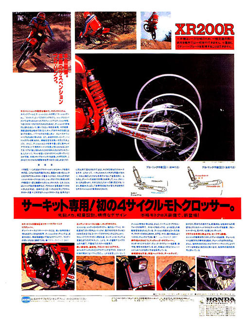 10年以上前にエンデューロレースに使っていた懐かしい車体ですが、もっとさかのぼれば大学時代に登場したそのモダンなスタイルに羨望の眼差しを送った対象でもあります。如何せん当時公道走行可能な逆輸入車は、60数万円也のプライスタグに手が届く一部の人間にしか縁のない存在でした。翌年、国内では限定数量がレーサーとして販売され、近年までモデルチェンジを経ながら、「XR200R」シリーズは2002年迄の長きを生き抜いていました。オリジナルコンディションの1981年型XR200R Rb (ME04型)はこんなバイクです。