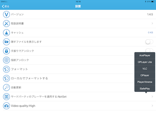 各種設定画面(右上端のギアマーク)で、動画品質(転送速度)の選択や、再生プレイヤーの変更等ができます。