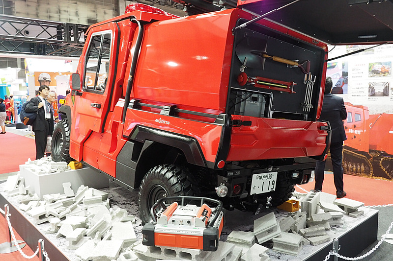 消防車両メーカー:モリタが、川崎重工の多用途四輪車「MULE PRO-FX(EPS)」ベースの小型オフロード消防車 Red Ladybugを開発、その他10台の消防車両と共に「東京国際消防防災展 2018」でお披露目展示されました。