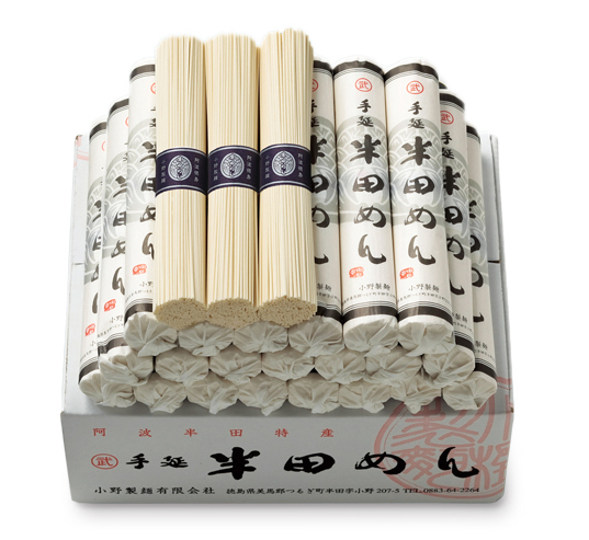 食べ方はいわゆる「そうめん」ですが、うどんより細くそうめんより太い平麺の半田素麺は、食感を含めていわゆる「そうめん」ではないです。讃岐うどん県のお隣、徳島県半田で作られるだけあって半田素麺(→Wiki)は「歯ごたえと喉越しにこだわった素麺」で、あえて小野製麺では「半田めん」と称しています。あえて言うなら「腰のある稲庭うどん」風にも見えます。