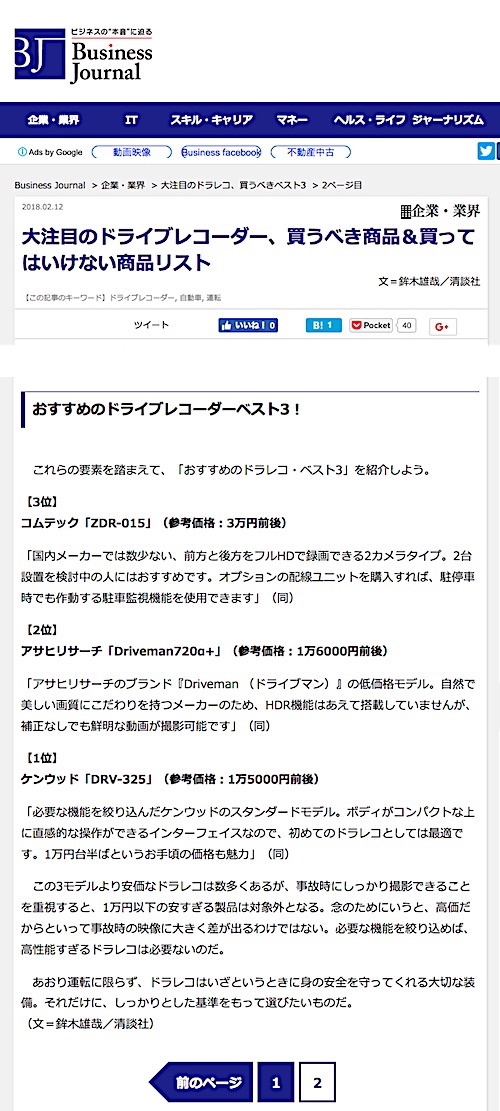 さらに記事タイトルにある「買うべき商品」は、実際の記事では「おすすめのドライブレコーダーベスト3」とトーンダウンで、しかも第1位を獲得した製品の選定理由が
