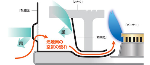 - ダブル風防ユニット搭載で 強風の中でも安定な火力を発揮