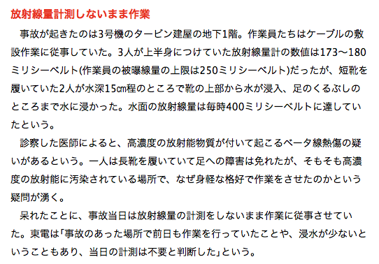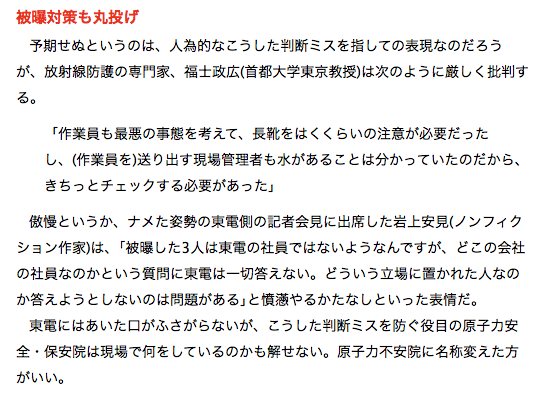 「平井憲夫:原発がどんなものか知ってほしい 〜 安全神話を信じてはいけない理由」が怪文書もしくは原発反対派によるフィクションとされる論は「なるほど」なんですが、冷ややかにせせら笑うほどカルイお話でもなく、技術屋さんや研究者が反論を得意げに話すことでもないです。「福島原発「被曝作業員」3人は下請け―業者名明かさぬ東電」のようなマネージメント側の不備が続くことこそが、いわゆる怪文書に現在でもなお「さもありなん」という見方をさせています。