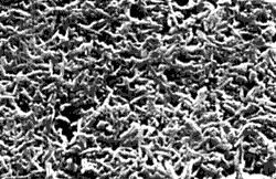 注2)磁性塗料:磁性を有する針状結晶の酸化鉄(Fe2O3) 粉を有機樹脂(塩化ビニル樹脂、ウレタン樹脂等)に分散させて作った塗料。 乾燥させて形成させた塗膜表面 の電子顕微鏡画像を見ると、酸化鉄粉が樹脂でくるまれて互いに接着している様子が解ります。