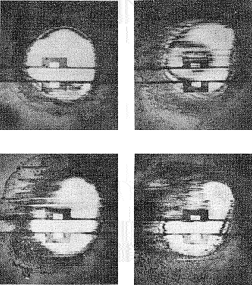 | (図3)中央の白い部分が磁気ヘッドとFDの摺動エリアで、試験経過とともに形状が変化していくのがわかります。 摺動初期の摺動面は安定した円形をしており、周辺部分が穏やかな2重縁を形成しています。 時間経過とともに摺動面が変化していきますが(図1)のダメージ部分と比較すると明らかなように、摺動面のうち、強く当たるようになった部分にダメージが大きいです。試験中途の周辺部分の大きな乱れは、摺動面が不均一になっていく過程で、一定の面圧でFDと摺動しなくなったことを表しています。アブラシビティー試験で良好な結果であるメーカーのFDは、大きな摺動変化がないことも確認されました。 | |