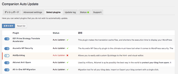 プラグインやテーマ、WordPressのコアファイルの自動更新の設定自体は、プラグインを使わなくてもかんたんなコードをfunctions.phpに追記するだけでいろいろアレンジ出来ますが、このプラグインを使うと個々のテーマやプラグインについて自動更新のON/OFFを設定出来ます。