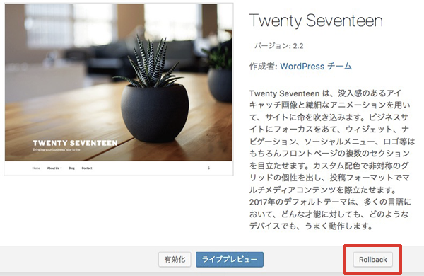 「Rollback」ボタンをクリックすると上記<テーマの復旧>と同様、旧バージョンのリスト一覧画面が表示されますから、任意のバージョンを選択して復旧させることができます。