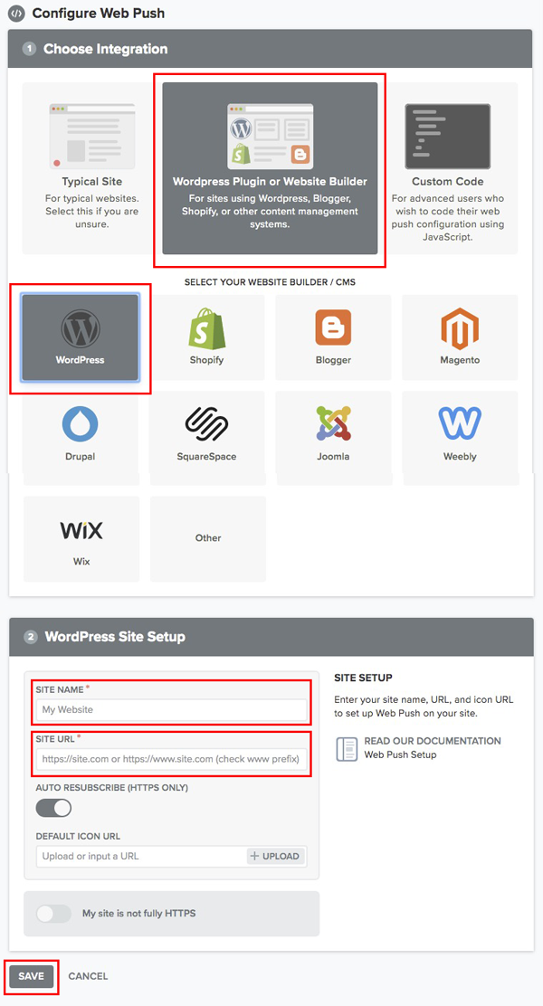 「Wordpress plugin」利用で、CMSとして WordPressを選択、SITE NAME、SITE URLを記入したら「SAVE」をクリック。