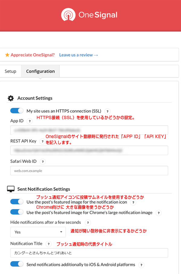 サイドメニュー「OneSignal Push」をクリック、Configuration画面で初期設定、動作設定を行います。下記が我が家のサイトでの設定例です。