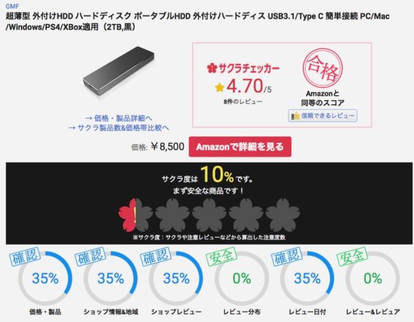amazonの怪しい製品を判定してくれるという「サクラチェッカー」サイト(https://sakura-checker.jp/)で上記の製品を判定してもらったところ...
